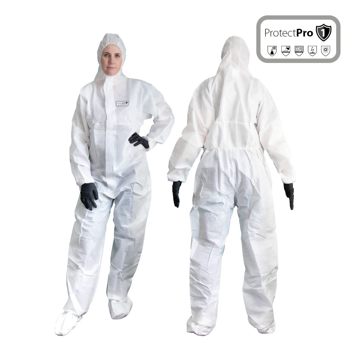 Der ProtectPro 1 Schutzanzug zeichnet sich durch eine optimale Passform aus. Er verfügt über eine dreiteilige Kapuze mit Gummizug, eine ebenso dreiteilige Schritteinlage, innenliegende Nähte sowie strapazierfähige Arm-, Bein- und Taillengummis. Dadurch sitzt der Overall sowohl bei Damen als auch bei Herren äußerst komfortabel.